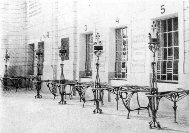 1904 р. Поручні вокзальних касРозмір зображення: 765:540 піксел А. Захаревич, фабрика Ю. Горецького. Поручні вокзальних кас. 1902-1903. Фото 1904 р. Джерело: Бірюльов Ю. Мистецтво львівської сецесії. – Льв.: Центр Європи, 2005 р., с. 87. |