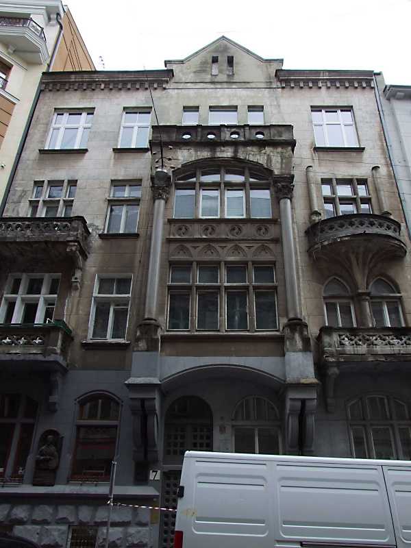 2012 р. Головний фасад Розмір зображення: 600:800 піксел 7 квітня 2012 р. Фото М.І.Жарких. Вкладені елементи Фрагмент фасаду з балконами Балкон 2-го поверху Меморіальна дошка М. Івасюку
