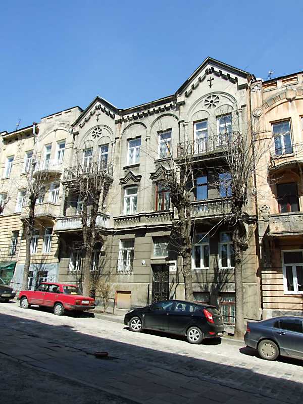 Житловий будинок (№ 9) Розмір зображення: 600:800 піксел 16 квітня 2013 р. Фото М.І.Жарких. Вкладені елементи 2013 р. Фронтон 2013 р. Балкон 2-го поверху 2013 р. Вхід