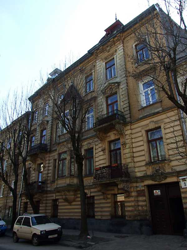 2013 р. Загальний вигляд Розмір зображення: 600:800 піксел 16 квітня 2013 р. Фото М.І.Жарких. Вкладені елементи Балкон 3-го поверху 3-й поверх еркера 2-й поверх еркера (+) Балкон 2-го поверху Вхід