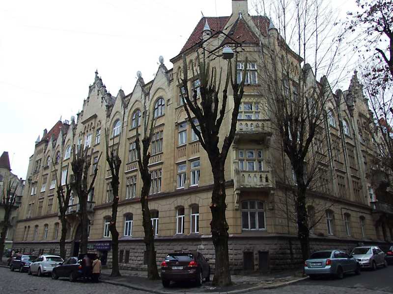 Житловий будинок (№ 14)Розмір зображення: 800:600 піксел 7 квітня 2012 р. Фото М.І.Жарких. Будинок в готичному стилі збудовано у 1909 за проектом Мар'яна Осінського для працівників залізниці. Ліворуч – вул. Глибока, праворуч – вул. Новий Світ. |