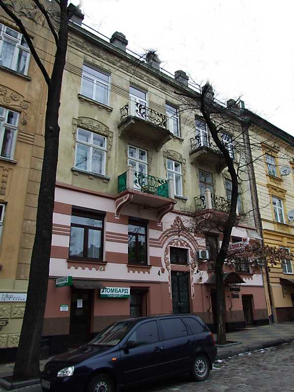 Будинок споруджено в 1908 р. на замовлення Катерини Рисяк за проектом В.Гертмана. 7 квітня 2012 р. Фото М.І.Жарких.