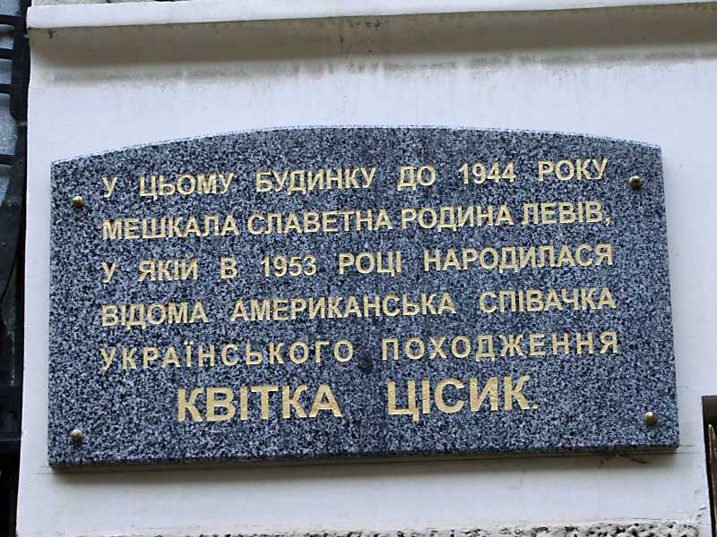 На дошці напис: «У цьому будинку до 1944 року мешкала славетна родина Левів, у якій в 1953 році народилася відома американська співачка українського походження Квітка Цісик».