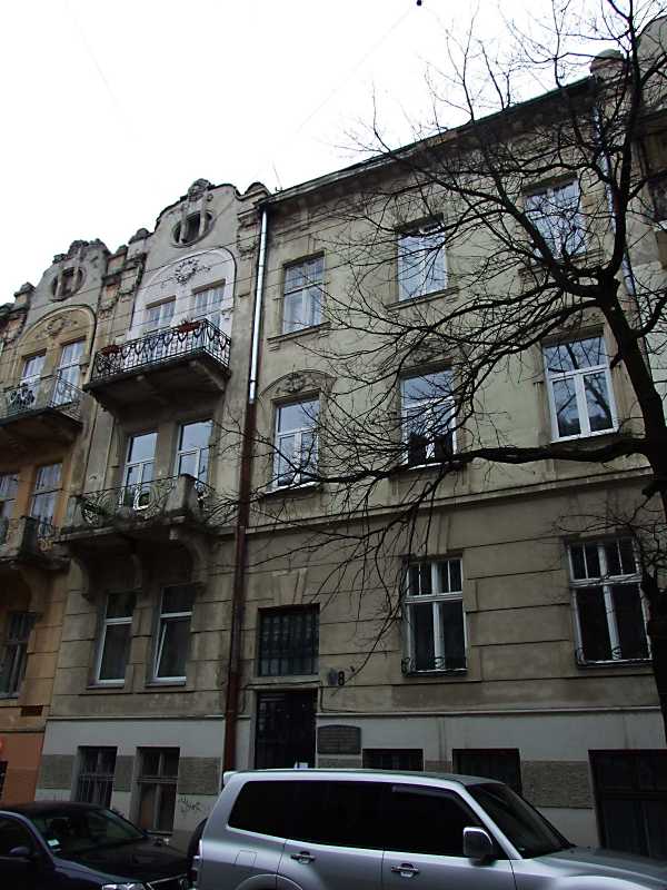 2012 р. Ліва частина головного фасаду Розмір зображення: 600:800 піксел 7 квітня 2012 р. Фото М.І.Жарких. Вкладені елементи Фронтон і балкон 4-го поверху Меморіальна дошка К. Цісик