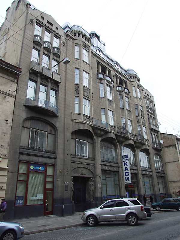 2012 р. Загальний вигляд Розмір зображення: 600:800 піксел 8 квітня 2012 р. Фото М.І.Жарких. Вкладені елементи Рельєф на лівому еркері Рельєфи на лівому еркері Сецесійний вхід (+) Центральна частина головного фасаду Рельєфи на правому еркері