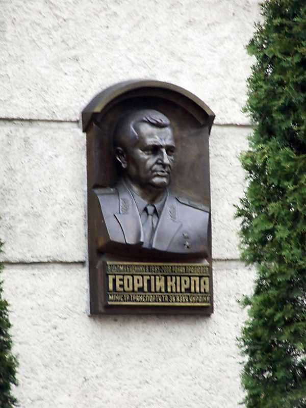 Меморіальна дошка Г. КирпіРозмір зображення: 600:800 піксел 8 квітня 2012 р. Фото М.І.Жарких. На дошці напис: «В цьому будинку в 1985 – 2000 роках працював Георгій Кірпа, міністр транспорта та зв’язку України». |