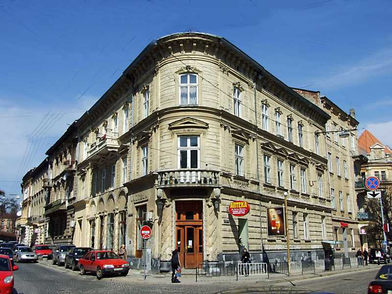2013 р. Загальний виглядРозмір зображення: 800:600 піксел Ліворуч – вулиця Грушевського, праворуч – вулиця І. Франка. 16 квітня 2013 р. Фото М.І.Жарких. |