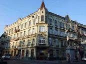 Ліворуч – вул. І. Франка, праворуч – вул. Костя Левицького. Будинок споруджено за проектом С.Рімера у готичному стилі.