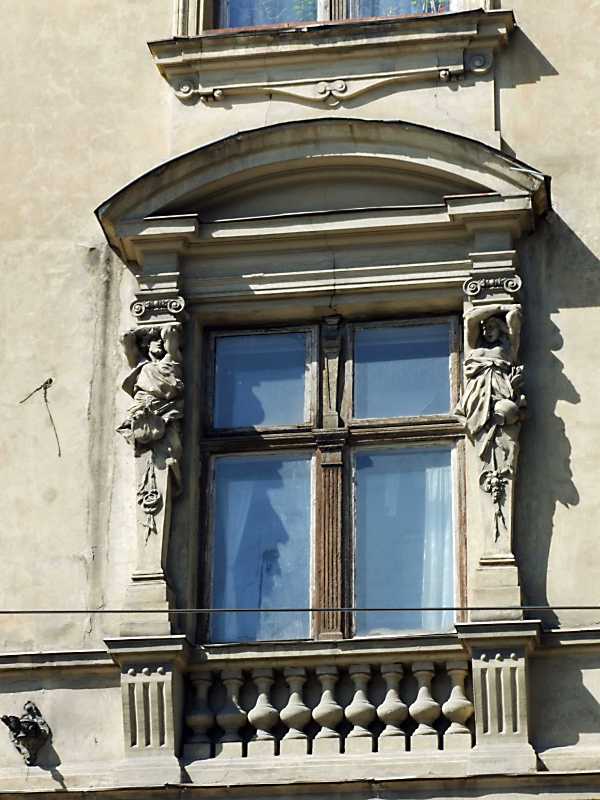 Вікно 2-го поверху (ліворуч) Розмір зображення: 600:800 піксел 16 квітня 2013 р. Фото М.І.Жарких. Вкладені елементи Ліва скульптурна пілястра Права скульптурна пілястра