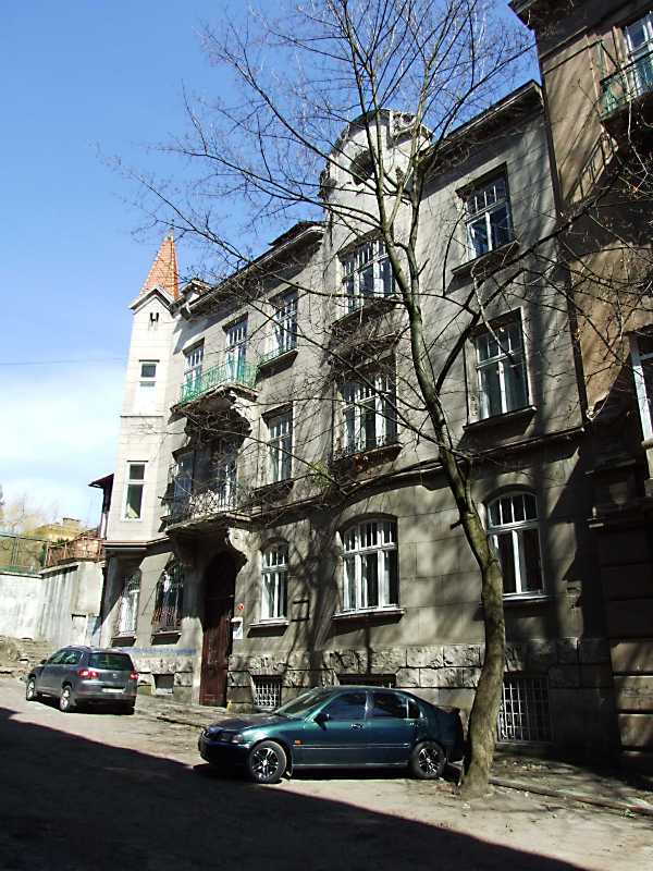 Головний фасад будинку виходить у двір, орієнтований поперек вул. І. Франка. 16 квітня 2013 р. Фото М.І.Жарких.