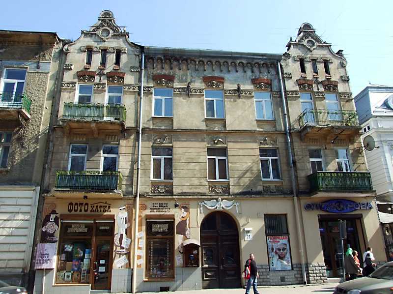 2013 р. Головний фасад Розмір зображення: 800:598 піксел 19 квітня 2013 р. Фото М.І.Жарких. Вкладені елементи Сецесійний фронтон Рельєфні прикраси над входом