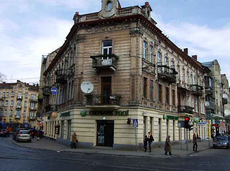 2012 р. Загальний виглядРозмір зображення: 800:594 піксел 4 квітня 2012 р. Фото М.І.Жарких. Ліворуч – вул. І. Франка, праворуч – вул. Шота Руставелі. |