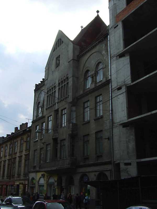 2012 р. Загальний вигляд Розмір зображення: 600:800 піксел 4 квітня 2012 р. Фото М.І.Жарких. Вкладені елементи Сецесійний рельєф на фасаді Сецесійна ніша з балконом