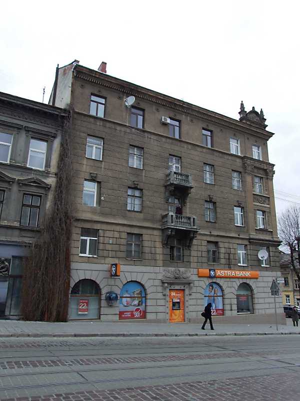 2012 р. Фасад по вул. Городоцькій Розмір зображення: 600:800 піксел 8 квітня 2012 р. Фото М.І.Жарких. Вкладені елементи Фронтон Вікна 3-4-го поверхів Вхід