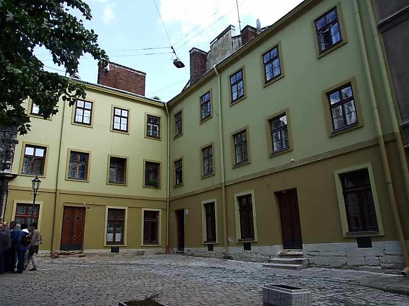 ЖИЛОЙ ДОМ, конец XVIII-XIX вв. (пл. Р. Люксембург, 5). Реконструирован в XIX в. Примыкает к южному фасаду часовни Боимов. Кирпичный, Г-образный в плане, трехэтажный, второй фасад выходит на ул. Галицкую. [Памятники градостроительства и архитектуры УССР. – К.: Будівельник, 1985 г., т. 3, с. 33].