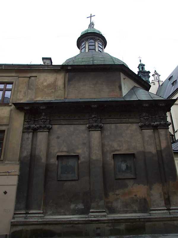 2012 р. Загальний вигляд зі сходу Розмір зображення: 600:800 піксел 8 квітня 2012 р. Фото М.І.Жарких. Вкладені елементи Капітелі пілястр (ліворуч) (+) Фриз (ліва частина) Капітель центральної пілястри Капітелі пілястр (праворуч) (+) Портрет Георгія Боїма Портрет Ядвіги Боїм