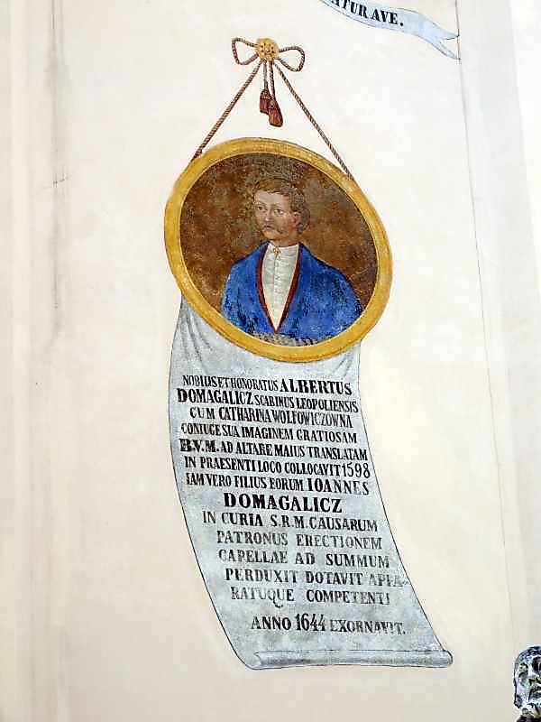 2007 р.Розмір зображення: 600:800 піксел Портрет і напис А.Домагалича на східній стіні апсиди. 14 вересня 2007 р. Фото М.І.Жарких. |