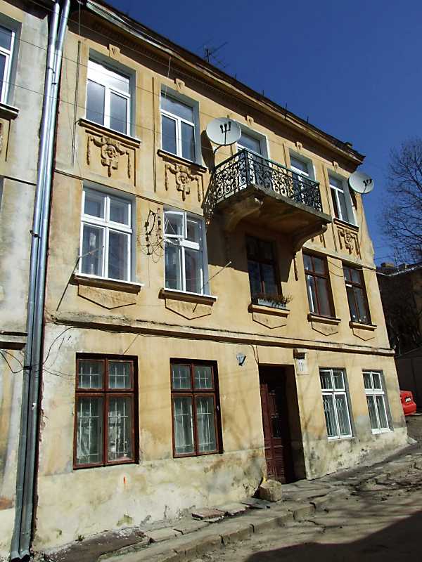 Житловий будинок (№ 11а)Розмір зображення: 600:800 піксел 18 квітня 2013 р. Фото М.І.Жарких. У Львові був поширений забобон проти числа 13, тому цей будинок має номер 11а замість 13. |