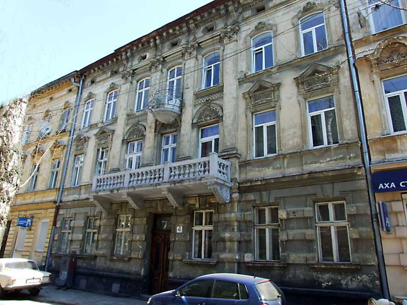 Житловий будинок (№ 4) Розмір зображення: 800:600 піксел 19 квітня 2013 р. Фото М.І.Жарких. Вкладені елементи 2013 р. Вікно 3-го поверху 2013 р. Балкон 2-го поверху 2013 р. Вікно 2-го поверху Вітраж сходової клітки (+)