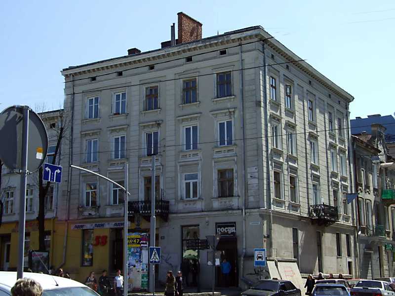 Житловий будинок (№ 11)Розмір зображення: 800:600 піксел Ліворуч – площа Князя Осмомисла, праворуч – вулиця Театральна. 18 квітня 2013 р. Фото М.І.Жарких. |