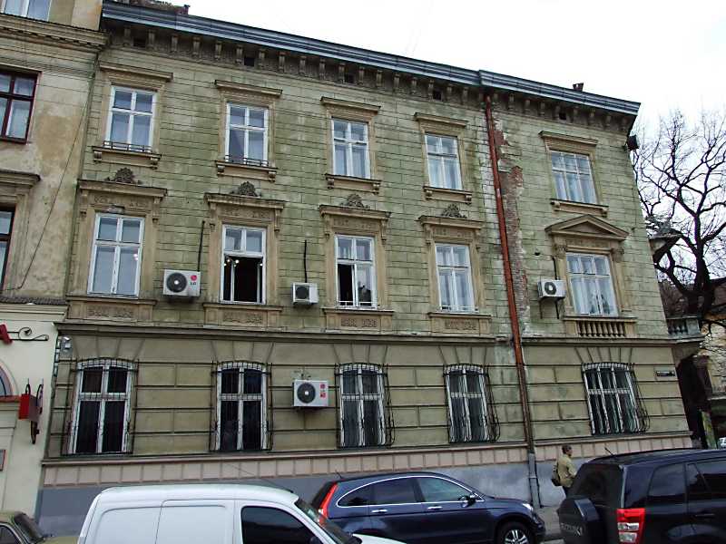 Житловий будинок (№ 42)Розмір зображення: 800:600 піксел Фасад по вул. Герцена. Вул. Князя Романа – праворуч, за рогом будинку. 4 квітня 2012 р. Фото М.І.Жарких. |