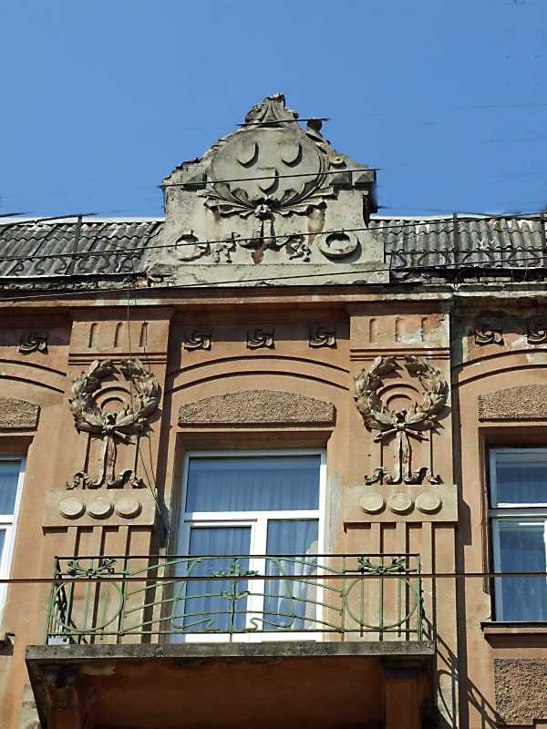 Сецесійний балкон 4-го поверху та фронтон Розмір зображення: 600:800 піксел 19 квітня 2013 р. Фото М.І.Жарких. Вище | Наступна сторінка