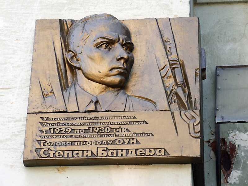На дошці напив: «У цьому будинку у колишньому Українському академічному домі з 1929 по 1930 рік проживав видатний політичний діяч, голова проводу ОУН Степан Бандера».