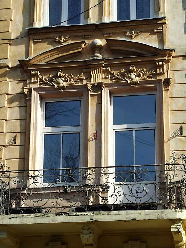 2013 р. Балкон 2-го поверху Розмір зображення: 600:800 піксел 16 квітня 2013 р. Фото М.І.Жарких. Вкладені елементи Рельєфна вставка над дверима