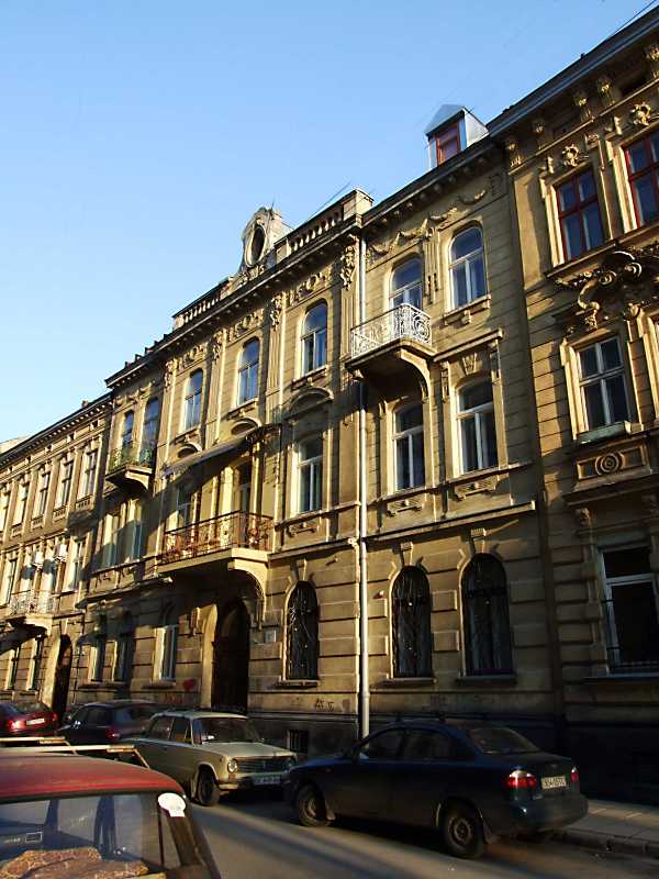 Житловий будинок (№ 11а)Розмір зображення: 600:800 піксел 16 квітня 2013 р. Фото М.І.Жарких. У Львові був поширений забобон проти числа 13, тому цей будинок має номер 11а замість 13. |