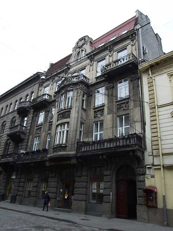 Будинок (вул.Коперніка, 12) споруджено в 1908 р. (архіт. М.Лужецький, Е.Жихович) у стилі класицизму, фасад оздоблено рельєфами “Чотири пори року”.