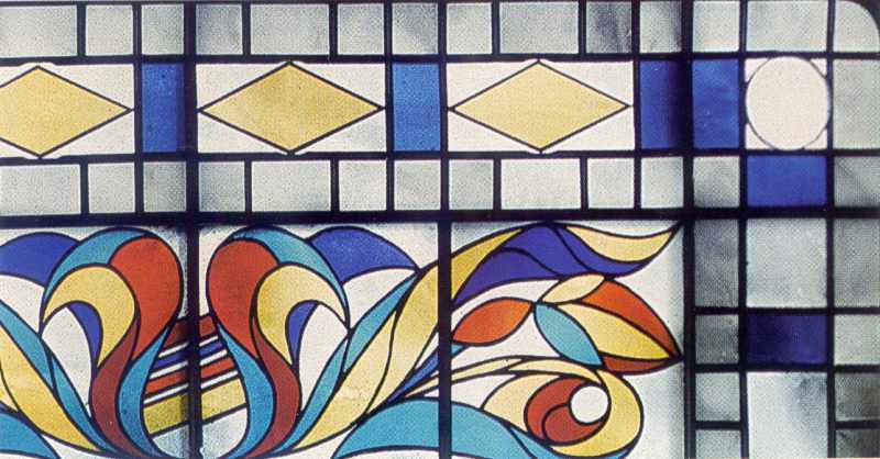 Фрагмент плафона сходової кліткиРозмір зображення: 800:418 піксел Фрагмент плафона сходової клітки будинку на вул. М.Коперника, 5. Джерело: Грималюк Р. Вітражі Львова кінця XIX – початку XX століття. – Льв.: 2004 р., с. 147. |