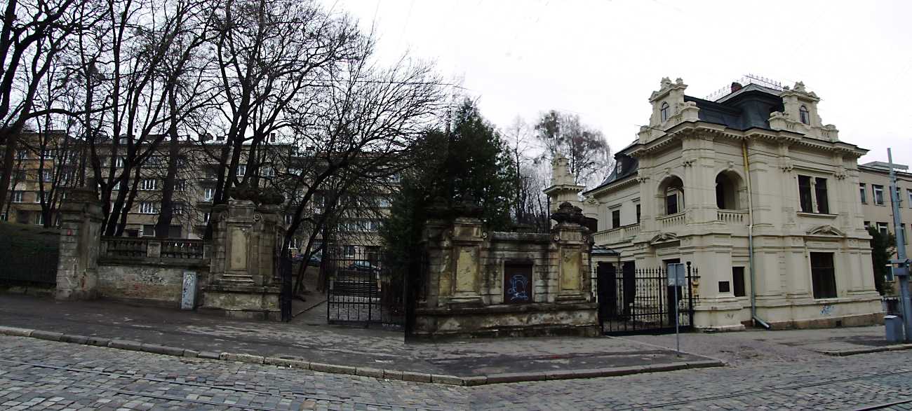 2012 р. Панорама з півдня Розмір зображення: 1300:587 піксел 7 квітня 2012 р. Фото М.І.Жарких. Вкладені елементи Ліва частина (брама) (+) Права частина (палац) (+)
