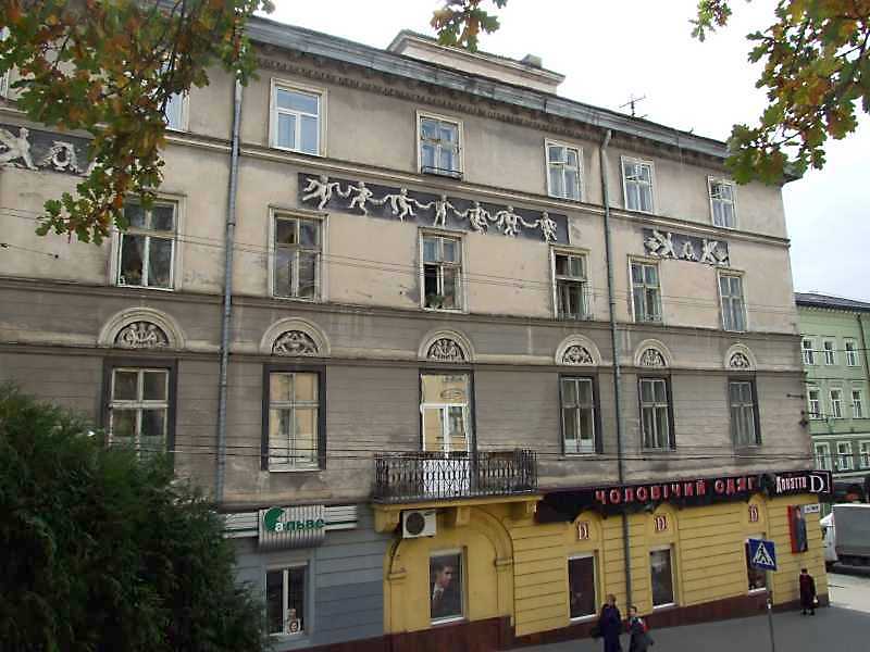2008 р. Фасад по вул. Гонти Розмір зображення: 800:600 піксел 16 жовтня 2008 р. Фото М.І.Жарких. Вкладені елементи Фрагмент 3-го поверху із фризом Рельєфна вставка 3-го поверху (+) Рельєфний тимпан вікна 2-го поверху Рельєфний тимпан вікна 2-го поверху