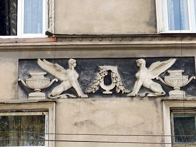 Рельєфна вставка 3-го поверху Розмір зображення: 800:600 піксел 16 жовтня 2008 р. Фото М.І.Жарких. Вкладені елементи Лівий сфінкс Правий сфінкс
