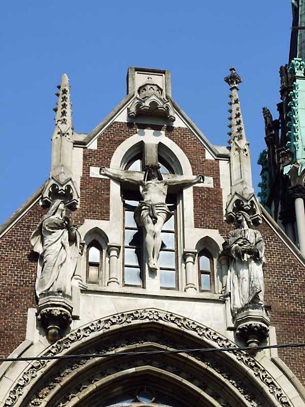 Фронтон з розп’яттям Розмір зображення: 600:800 піксел 19 квітня 2013 р. Фото М.І.Жарких. Вкладені елементи Марія Розп’ятий Ісус Св. Іоан