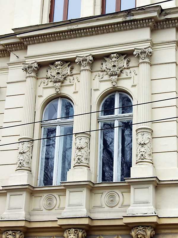 2012 р. Вікна 2-го поверху Розмір зображення: 600:800 піксел 7 квітня 2012 р. Фото М.І.Жарких. Вкладені елементи Рельєфна вставка над вікном