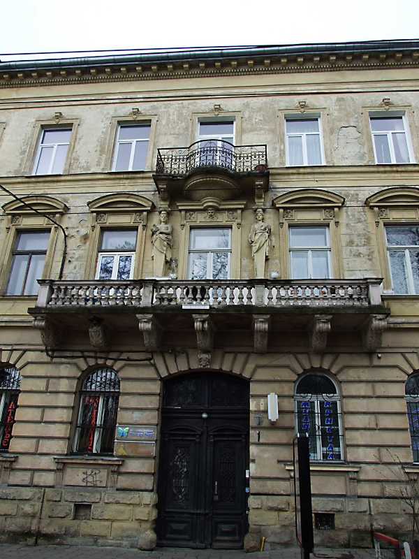 2012 р. Центральна частина головного фасаду Розмір зображення: 600:800 піксел 7 квітня 2012 р. Фото М.І.Жарких. Вкладені елементи Балкон 3-го поверху Вікно 2-го поверху і скульптури Балкон 2-го поверху Вхід