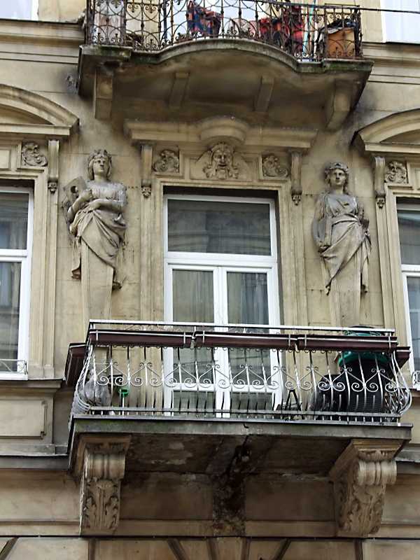 Балкон 2-го поверху Розмір зображення: 600:800 піксел 8 квітня 2012 р. Фото М.І.Жарких. Вкладені елементи Ліва скульптура Права скульптура