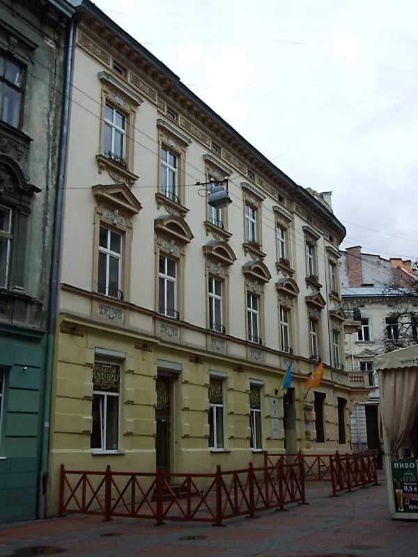 2012 р. Бічний фасад в ракурсі Розмір зображення: 600:800 піксел 8 квітня 2012 р. Фото М.І.Жарких. Вкладені елементи Вікно 3-го поверху Вікно 2-го поверху (+) Вхід
