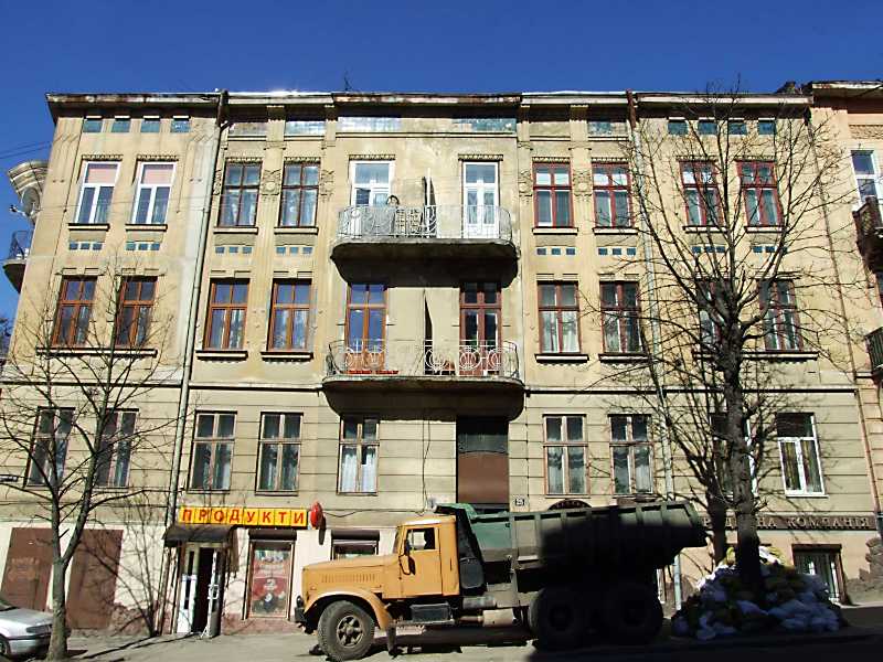 2013 р. Фасад по вул. Кривоноса Розмір зображення: 800:600 піксел 18 квітня 2013 р. Фото М.І.Жарких. Вкладені елементи Сецесійні вікна 4-го поверху
