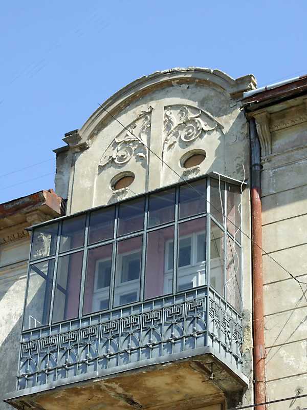 2013 р. Балкон 3-го поверху із сецесійним фронтоном (2)Розмір зображення: 600:800 піксел 18 квітня 2013 р. Фото М.І.Жарких. |