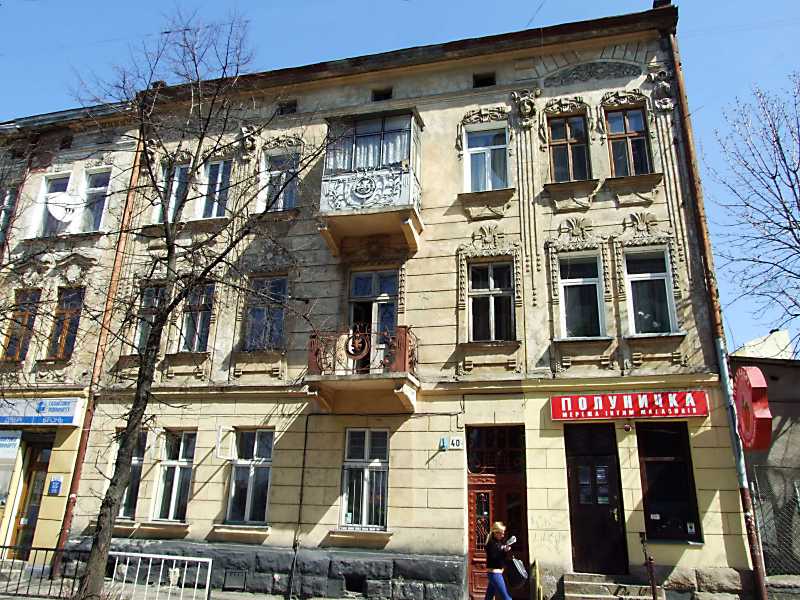 Житловий будинок (№ 40) Розмір зображення: 800:600 піксел 18 квітня 2013 р. Фото М.І.Жарких. Вкладені елементи 2013 р. Сецесійний балкон 3-го поверху 2013 р. Сецесійні вікна 3-го поверху (+) 2013 р. Сецесійний балкон 2-го поверху 2013 р. Сецесійні вікна 2-го поверху