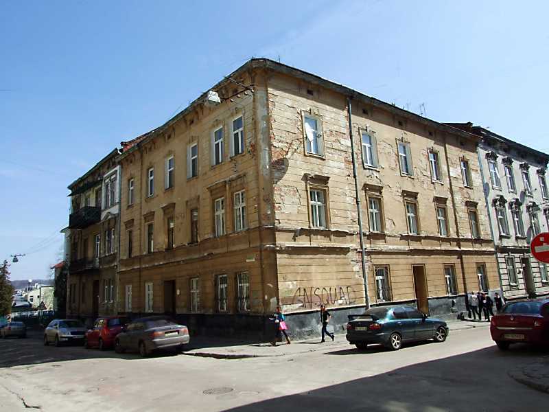 Житловий будинок (№ 21)Розмір зображення: 800:600 піксел Ліворуч – вулиця Кирила і Мефодія, праворуч – вулиця Кобилянської. 16 квітня 2013 р. Фото М.І.Жарких. |