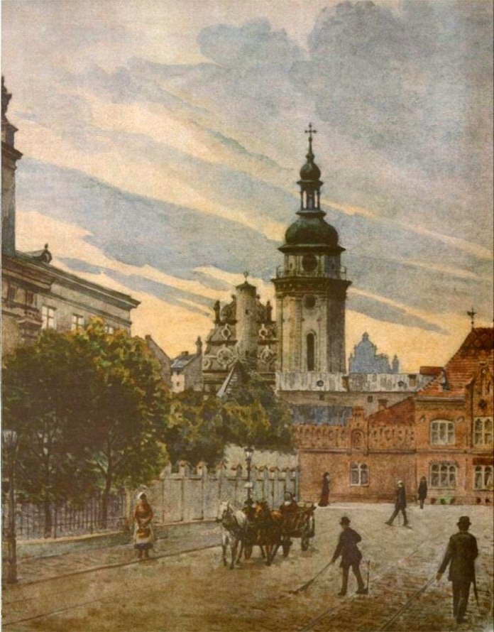 Вид з вул. Личаківської на будинок пожежної команди (нині не існує) та костьол бернардинців. Акварель А.Каменобродського. Поч. XX ст. ЛІМ