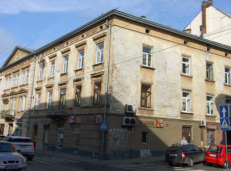 2019 р. Наріжна частина будинкуРозмір зображення: 800:591 піксел Фото М.І.Жарких, 4 жовтня 2019 р. Ліворуч – вул. Личаківська, праворуч – вул. Смольського. |