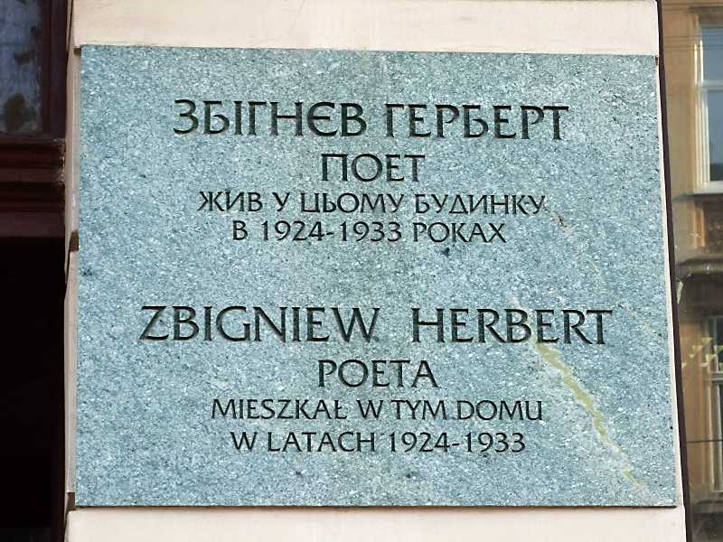 На дошці напис: «Збігнєв Герберт, поет, жив у цьому будинку в 1924 – 1933 роках» + те саме польською мовою.