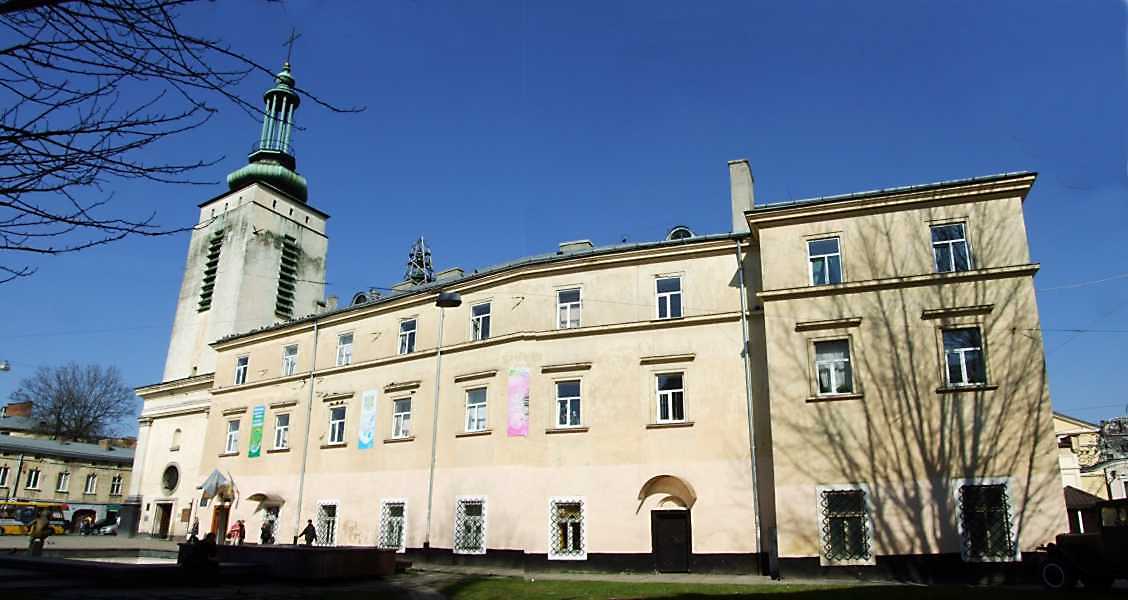 2013 р. Панорама корпусу келій із заходу Розмір зображення: 1128:600 піксел 18 квітня 2013 р. Фото М.І.Жарких. Вкладені елементи Ліва частина Права частина