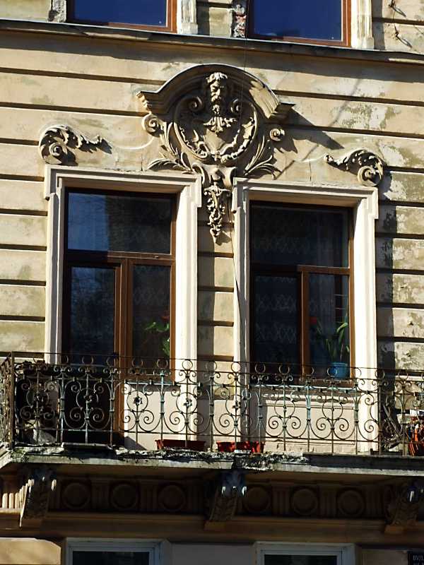 Наріжний балкон 2-го поверху Розмір зображення: 600:800 піксел 18 квітня 2013 р. Фото М.І.Жарких. Вкладені елементи Картуш з маскароном