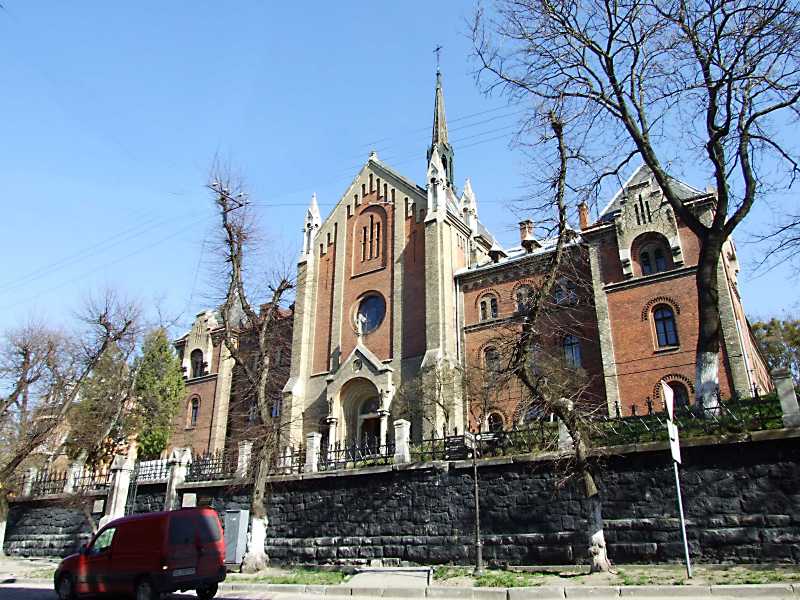 2013 р. Загальний вигляд з позиції С3 Розмір зображення: 800:600 піксел 18 квітня 2013 р. Фото М.І.Жарких. Вкладені елементи Пінаклі та сигнатура Романський щипець нави Фрагмент головного порталу Фрагмент корпусу келій Вікно 2-го поверху