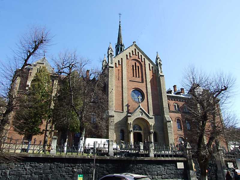 2013 р. Загальний вигляд з позиції С3 Розмір зображення: 800:600 піксел 18 квітня 2013 р. Фото М.І.Жарких. Вкладені елементи Мозаїка в ніші фронтона Мозаїка Ісуса Христа в тимпані над входом Капітель портала